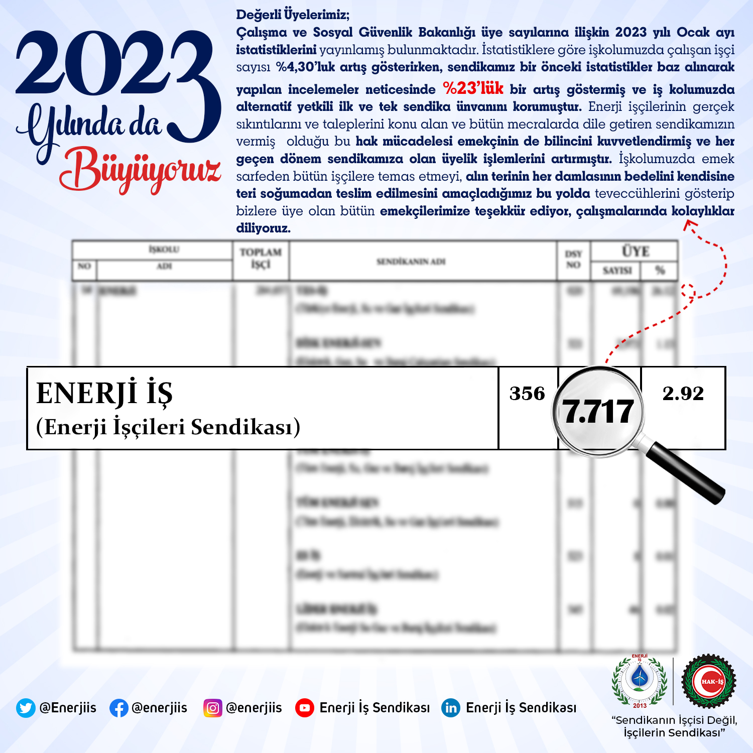 Çalışma ve Sosyal Güvenlik Bakanlığı üye sayılarına ilişkin 2023 yılı Ocak ayı istatistiklerini yayınlamış ve sendikamız bir önceki istatistikler baz alınarak yapılan incelemeler neticesinde %23’lük bir artış göstermiştir.
